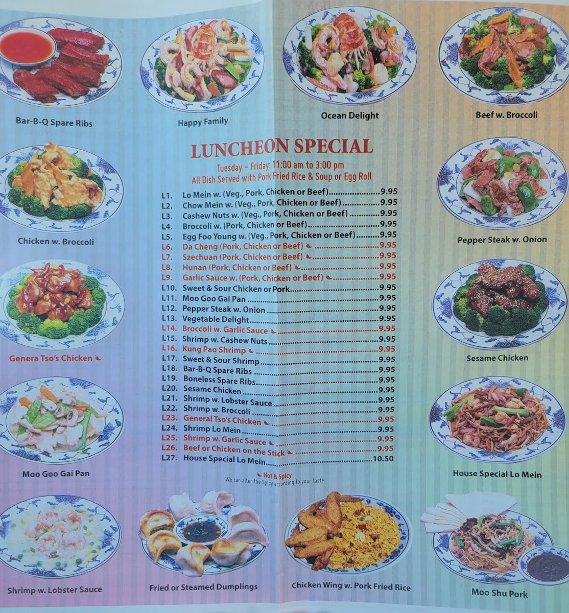 Fresh vegetables, tender proteins, and well-seasoned sauces bring balance to every dish. Crisp broccoli, aromatic garlic, and savory soy-based sauces combine to create satisfying flavor and texture in each bite. The menu also includes vegetarian-friendly options such as vegetable lo mein and tofu dishes, along with lighter steamed selections for guests seeking healthier choices. Simple rice and noodle dishes make the menu approachable for children as well.